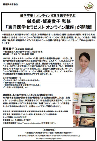 お好きな場所でお好きな時間に学習から資格 取得までできるオンラインスクール「東洋医学セラピスト オンライン講座」を開講しました。この機会に御社 媒体で鍼灸師・飯髙貴子のメディア出演やスクール情報の掲載をご検討いただきたく、ご案内をお送りい たします。