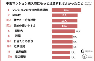 株式会社EST GROUP(本社:東京都渋谷区、代表取締役:渡邊 亮介)は、自宅用に中古マンションを購入したことがある人103人を対象に「中古マンションの購入時に注意すればよかったことに関する意識調査」を実施し、そのデータをランキングにしました。