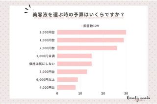 「 美容液を選ぶ時の予算はいくらですか?」とアンケート調査した結果、1位は『3,000円台(30人)』、2位は『1,000円台(29人)』、3位は『2,000円台(26人)』となっています。