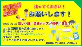 みらいふ94(東京都町田市、代表:本舘純)は、7月8月の強化アイテムとして主に生活困窮者支援のために役涼しい夏物衣料、涼感グッズ、帽子、日傘など、使わなくなった熱中症対策グッズを無料で回収しトイレットペーパーかボックスティッシュと交換する取り組みを2023年7月13日 7時より受付を開始いたします。
