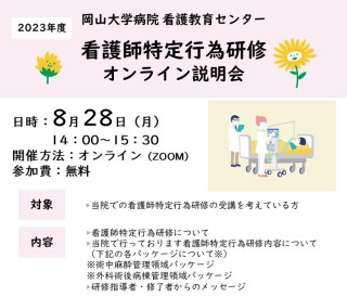 国立大学法人岡山大学(本部:岡山市北区津島中、学長:那須保友)の岡山大学病院(本院:岡山市北区鹿田町、病院長:前田嘉信)看護教育センターは、看護師特定行為研修の受講を考えている方を対象に2023年8月28日(月) の14時~15時30分に「2023年度 看護師特定行為研修 オンライン説明会」を開催します。