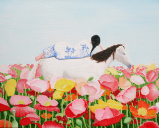 また、青華白磁(李王朝後期に主流を成した陶磁器)の模様を2次元の絵画の中に取り入れる新しい試みも行ったいる。