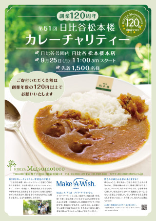 )は、恒例の【カレーチャリティー】を2023年9月25日(月) に開催する運びとなりました。この催しは、本年で第 51回目を迎えます。第1回目から50回目まで本イベントでカレーを召上がられた方は、延べ108,790名となり、その賛同寄付金及び当店の寄付金の合計は、29,610,795円になりました。<10 円カレー>としておなじみでしたが、時代もかわり、寄付先に少しでも多くお渡ししたいと考え、今年からは日比谷松本楼の創業年数と同じ金額以上のご寄付をお願いすることにいたします。本年は創業年数 120 年にあわせ、120 円以上のご寄付でカレーを召し上がって頂きます。チャリティの精神をご理解いただきご賛同いただいた寄付金は、当店の寄付金と併せて全額を公益財団法人 メイク・ア・ウィッシュ オブ ジャパン(理事長 八木昌実) に寄付させていただきます。 メイク・ア・ウィッシュ オブ ジャパンは難病のこどもたちの夢を叶えることを唯一の目的とした国際的ボランティアの団体です。(www.mawj.org)