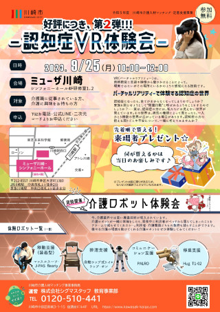 9月25日(月) ミューザ川崎4F 研修室1・2にて、認知症VR体験会・介護ロボット体験会・インストラクター研修の第二弾を開催いたします!