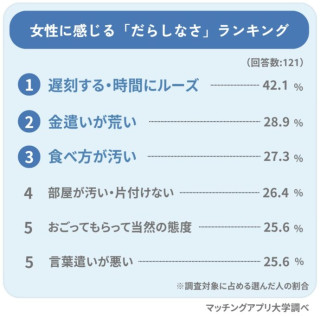 男性121人に「だらしない女」と感じる行動・様子について聞いてみました。1位は「遅刻をする・時間にルーズ」で42.1%が「だらしないと感じる」と回答しました。