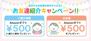 プラン契約中の会員が紹介したお友達がプラン契約と商品注文をすると、その特典として、紹介をした会員とお友達の両方が「Amazonギフト500円」をもらえます。