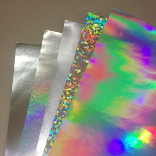 弊社オリジナル「ホログラムシート紙」の絵柄は【レインボー】【ヘアライン】【シルバー】【サンド】【スモールシャタード】の5種類。サイズ:約570mm×約500mm 厚み約0.15mmの大判の蒸着紙です。