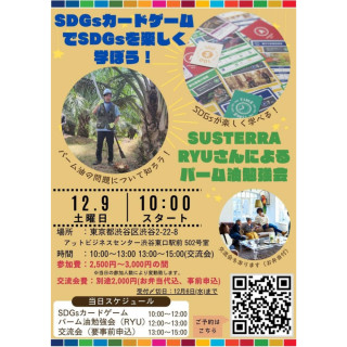 SDGsカードゲーム公認ファシリテーター、サスティナブル関連の情報発信で人気を集めるSusterra(サステラ)氏の2名を講師として招き、「カードゲームを通してSDGsの本質理解」、「パーム油の実情を知り社会課題の自分事化」を目的としたイベントとなっております。