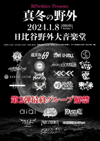 お正月も明けて間もない成人式当日の2024年1月8日 (月・祝)、日比谷野外音楽堂を舞台に「真冬の野外」と題した冬に激アツアイドルフェスを開催する。出演者には、以下の豪華な面々が決まっている。