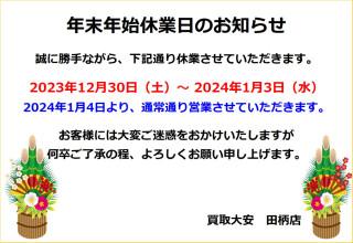買取大安は、2023年12月30日(土) ~2024年1月3日(水) まで休業とさせていただきます。