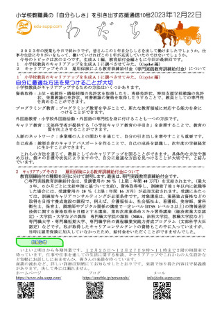 7号まで順調に発行してきましたが、8号からはなかなか記事が集まらず、およそ2ヶ月ぶりの発行になりました。12月は8.9.10号連続でアップしました。トピックは教員のキャリアアップです。小学校教員のキャリアアップについて、生成AIに聞いてみました。もう一つは雇用保険による教育訓練給付金です。しかし、これは正規教員は地方公務員であり、公務員は雇用が安定しているため、雇用保険に入ることができません。ですから直接には関係ありません。しかし、短期勤務になったり、再任用だったりなど、雇用形態が変わると雇用保険に入れることがあるため、掲載しました。2023年12月26日