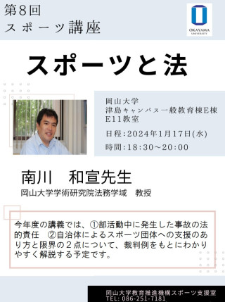 今回、第8回となるスポーツ講座「スポーツと法」を2024年1月17日(水) 18:30~20:00に岡山大学津島キャンパス(岡山市北区)にて開催します。