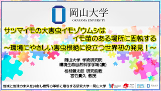 沖縄県病害虫防除技術センターの浦崎貴美子班長と岡山大学学術研究院環境生命自然科学学域の松村健太郎研究助教と宮竹貴久教授らの研究グループは、サツマイモの大害虫で特殊害虫に指定されているイモゾウムシ(Euscepes postfasciatus)がサツマイモの植物苗のどの部分に滞在するか48時間、調べたところ、昼間は雌雄とも節に滞在し、交尾が生じる夜間は、とくにメスが苗から移動し離れる一方で、マウント(交尾を含む)行動は苗の節で見られ、卵を地際部の苗に産み付ける習性があることを世界で初めて発見しました。
