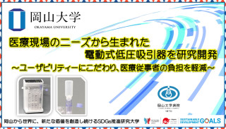 国立大学法人岡山大学(本部:岡山市北区、学長:那須保友)の岡山大学病院(岡山市北区)と株式会社三幸製作所(さいたま市西区)は、臨床現場のニーズ探索、分析などをもとに電動式低圧吸引器を共同で研究しました。
