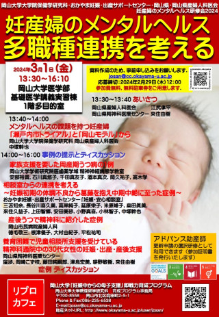 国立大学法人岡山大学(本部:岡山市北区、学長:那須保友)では、2024年3月1日(金) 14:00~16:40に「妊産婦のメンタルヘルス研修会2024 妊産婦のメンタルヘルス 多職種連携を考える」を本学鹿田キャンパスの医学部基礎医学講義実習棟1階多目的室で開催します。