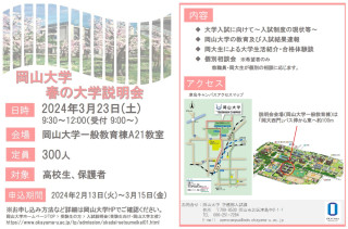 国立大学法人岡山大学(本部:岡山市北区、学長:那須保友)では、3月23日(土) に「高校生必見!岡山大学春の大学説明会」を本学津島キャンパスで開催します。
