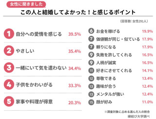 3位の「一緒にいて気を遣わなくてよいところ」と4位の「子供をかわいがるところ」も多くの票を集めており、およそ3人に1人の女性が「この人と結婚してよかった」と感じるポイントとしてあげました。