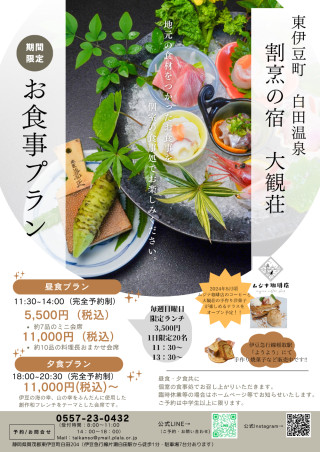 「割烹の宿大観荘」といえば、何といってもお食事が売りの宿です。部屋からの景色がいいわけではなく、周りに大きな観光施設があるわけでもありません。宿泊のお客様が来られる一番の理由は、「大観荘のお食事が食べたいから」です。家族で営業しているため、普段は宿泊のお客様を優先し、ランチやディナーのみのご予約はお断りさせていただくことが多々ありました。この機会に、弊社のお食事を地元のお客様にも食べていただきたいという思いでランチ・ディナープランを作成した次第です。