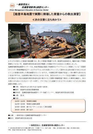 一般財団法人危機管理教育&演習センター (本社:東京都中央区、理事長:細坪 信二)は、能登町消防団松波分団の協力のもと能登町松波地区倒壊現場において、能登半島地震で実際に倒壊した家屋からの救出演習~次の災害に立ち向かう~を、2024年4月20日(土) に現地で開催いたします。