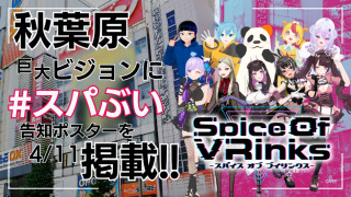 4/12(金)にVRChatで開催される大型プレゼン&ト2024年4月10日(水) ークショウイベント「SpiceOfVRinks」(略称 #スパぶい)は前日の4/11(木)に秋葉原駅前の巨大ビジョン「オノデンMXビジョン」にクラウドファンディングを介さず単独で掲載します。
