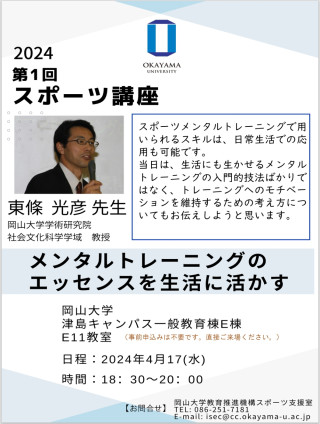 今回、2024年第1回となるスポーツ講座「メンタルトレーニングのエッセンスを生活に活かす」を2024年4月17日(水) 18:30~20:00に岡山大学津島キャンパス(岡山市北区)にて開催します。