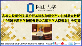 今回の受賞を受け仁科教授は、「受賞対象となった研究は、私が研究者として独立してから新たに開始したものです。国内外・産学界の多くの方と議論し、築き上げてきた成果がこのような形で認められたことは、大変嬉しく思います。自分の研究にさらに磨きをかけるとともに、これまでの経験をより若い世代の研究者と共有し、岡山大学の研究者が世界のトップクラスに肩を並べられるよう切磋琢磨していきたいと思います」と喜びと今後の抱負を述べました。