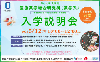 国立大学法人岡山大学(本部:岡山市北区、学長:那須保友)大学院医歯薬学総合研究科(薬学系)は、今後大学院への進学を目指す学内外の学生に医歯薬学総合研究科(薬学系)の教育、研究プログラムを広く周知することを目的として、2024年5月12日(日) にハイブリッドで入学説明会を開催します。現地開催参加の方は、希望があれば薬学系教員との個別相談も実施します。