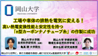 国立大学法人岡山大学(本部:岡山市北区、学長:那須保友)の大学院自然科学研究科の亀高諄大学院生(研究当時、現・ローム株式会社)、岡山大学学術研究院環境生命自然科学学域(工)の鈴木弘朗研究准教授、西川亘助教、林靖彦教授らは、東京工業大学のSergei Manzhos准教授、Southern University of Science and Technology(中国)のAung Ko Ko Kyaw准教授と共同で、CNTを無数に束ねた糸である「CNT紡績糸」を高結晶化する通電加熱処理とn型ドーピングのプロセス開発によって、低温域(150℃以下)での高い熱電変換性能を実現しました。