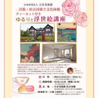 本講座では、普段は旧古河邸ガイドツアーのみでお入りいただける「2階主寝室」にて、各回15名の少人数制で講座特製のティーセットを召し上がりながら、当館学芸員による浮世絵鑑賞講座をお楽しみいただける企画です。