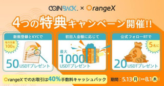 CoinBack(@CoinBack_jpn)とOrangeX(@OrangeXJapan)の公式Xアカウントをフォローし、関連ツイートをリツイートすることで、抽選で5名に20 USDTの体験金が提供されます。