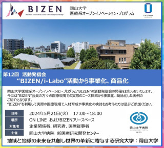病院でのオープンイノベーション活動にご興味・ご関心のある、もしくは入会・入居をご検討されている企業様、研究者様、学生の皆様に対し、岡山大学医療系オープンイノベーション・プログラム"BIZEN"と関わりのある情報を共有することにより、イノベーションの種を広げることを目的として開催します。