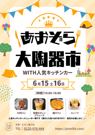 2024年6月15日(土) 2024年6月16日(日) ピオン富士店で、国産美濃焼をお得に購入できる「あおぞら大陶器市」が開催されます!さらに、人気キッチンカーとのコラボイベントも同時開催!
