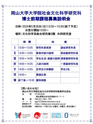 国立大学法人岡山大学(本部:岡山市北区、学長:那須保友)の大学院社会文化科学研究科(博士前期課程)は、今後大学院への進学を目指す方・受験を考えている方に本研究科の教育内容や入試の説明等を広く周知することを目的として、2024年5月26日(日) に本学津島キャンパスの文化科学系総合研究棟2階共同研究室で「募集説明会」を開催します。