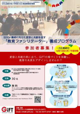 グローバル・シチズンシップ育成事業を手掛ける一般社団法人グローバル教育推進プロジェクト(GiFT)(東京都品川区、代表:辰野まどか)は、文部科学省の2024年度ユネスコ活動費補助金(SDGs達成の担い手育成(ESD)推進事業)の採択事業として、教員または教育関係者を対象に『SDGs 達成に向けた変容と共創を促す「教育ファシリテーター」養成プログラム』を実施します。