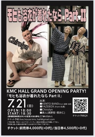 そのこけら落とし公演が、7月21日(日) に行うKMC HALL GRAND OPENING PARTY「モヒも浴衣が着れたなら Part Ⅱ」になる。出演するのが、Cyrolyn、鉄人(髙野哲・照井仁) 、KENTO BAND(室蘭)、FAZE BOX(札幌)。この時期、Cyrolynが主催するツアーの北海道編「モヒも浴衣が着れたなら Part Ⅱ」へ鉄人(髙野哲・照井仁)が帯同することから、同ツアーの一環として参加という形にはなっているが、KMC HALLという名を高野哲に相談して決めた事や、昔から亀山氏と縁がある関係から、こけら落とし公演を決めた経緯もある。 先日より、チケットの予約を開始。気になった方は、ぜひ足を運んでいただきたい。