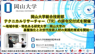 国立大学法人岡山大学(本部:岡山市北区、学長:那須保友)技術統括監理本部を構成する組織のひとつである総合技術部は2024年6月17日 、本学津島キャンパスの環境理工棟会議室において、テクニカルリサーチャー(TR)の辞令交付式を開催しました。