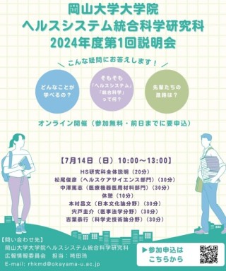 国立大学法人岡山大学(本部:岡山市北区、学長:那須保友)の大学院ヘルスシステム統合科学研究科では、オンラインでの大学院説明会を、2024年7月14日(日) 10:00~13:00にオンラインで開催する運びとなりました。