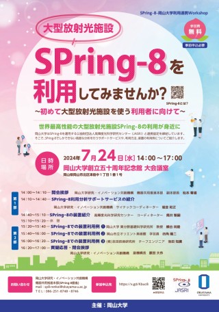 国立大学法人岡山大学(本部:岡山市北区、学長:那須保友)では、2024年7月24日(水) 14:00~17:00に、岡山大学-SPring-8(JASRI)連携Workshop「大型放射光施設SPring-8を利用してみませんか?」をハイブリッドで開催します。
