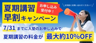 2024年7月31日(水) までにご入塾いただき、7/20(土)から開講中の夏期講習にお申し込みいただいた方は、夏期講習の料金が割引となるキャンペーンを実施いたします。