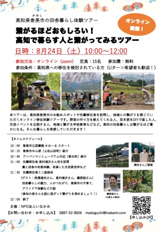 日時は2024年8月24日(土) 10:00〜12:00。自宅から参加できる2時間だけのオンラインツアーとなっていますので、ぜひこの機会に高知の暮らしを体験してみてください!