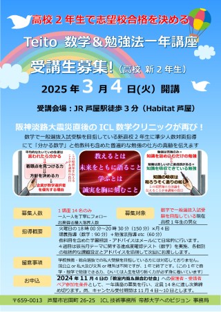 「帝都大学へのビジョン」でお馴染みのICL技術事務所(所在地:兵庫県芦屋市岩園町26-25、代表者:奥村栄弘)は、阪神間在住の2025年新高校2年生を対象として「teito 受験数学&学習法 一年講座」を2025年3月 に開講するにあたり、2024年8月7日 より受講生の募集を開始いたします。