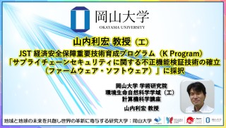 国立大学法人岡山大学(本部:岡山市北区、学長:那須保友)学術研究院環境生命自然科学学域(工)計算機科学講座の山内利宏教授が、国立研究開発法人科学技術振興機構(JST)経済安全保障重要技術育成プログラム(K Program)の研究開発構想「サプライチェーンセキュリティに関する不正機能検証技術の確立(ファームウェア・ソフトウェア)」に採択されました。