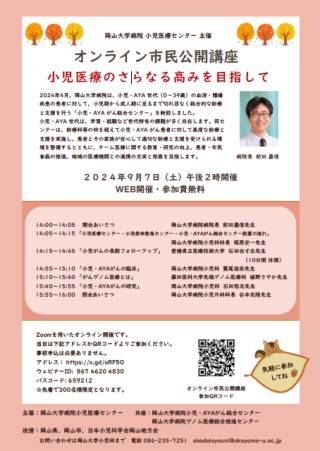 国立大学法人岡山大学(本部:岡山市北区、学長:那須保友)は、2024年9月7日(土) に岡山大学病院小児医療センター主催でオンライン市民公開講座「小児医療のさらなる高みをめざして」を開催します。