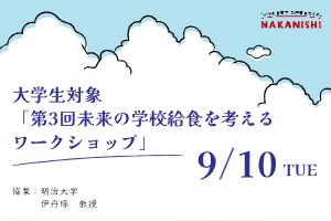 株式会社中西製作所(以下、当社)は、2024年9月10日(火) に当社の東京本社にあるテストキッチンにて、大学生を対象とした「第3回未来の学校給食を考えるアイデアソンワークショップ」を開催いたします。