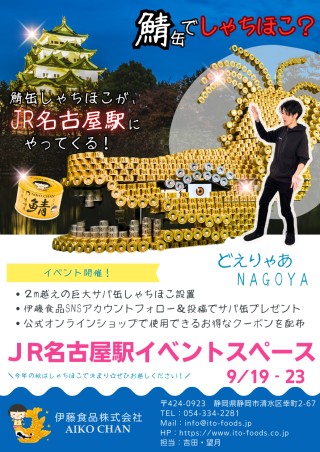 伊藤食品としては約5年ぶりとなるPRイベントを、今度は名古屋で巨大しゃちほこを設置し開催いたします。昨今サバの不漁などもありサバ缶詰の安定した生産供給が行えず、サバ缶詰をもっと広めたいのに広められないもどかしい時期が続きました。弊社としても美味しいサバ缶詰をお届けしたい一心で原料確保に努めた結果、今回イベントを開催できる運びとなりました。弊社は化学調味料・増粘多糖類不使用で安心安全にこだわった缶詰を製造しております。「美味しい缶詰を子ども達に食べさせたい」をモットーにサバ缶詰やツナ缶詰などの定番品に加え、カルビやリゾットなど変わり種缶詰も取り揃えております。味や品質にこだわったお客様から根強い支持をいただいている弊社ブランド「AIKO CHAN」を、日本のみならず世界に向けて進出させる第一歩として、今回のイベントを盛り上げていきます!