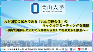 今後、本学は、筑波大学、山梨大学、大阪大学との連携をより一層深めつつ、わが国初の試みである共生型連合体を通じた社会変革の推進に向け、挑戦を続けます。また本取り組みは、岡山大学長期ビジョン2050「地域と地球の未来を共創し、世界の革新に寄与する研究大学」の実現を目指し、昨年度に採択された文部科学省の「地域中核・特色ある研究大学強化促進事業(J-PEAKS)」(実施主体:日本学術振興会)の取り組みにおいても重要なひとつの点として、全学を挙げて戦略的に実施しています。引き続き、地域中核・特色ある研究大学:岡山大学と共生型連合体の活躍にご期待ください。