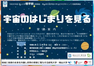 国立大学法人岡山大学(本部:岡山市北区、学長:那須保友)の理学部では、2024年11月9日(土) に公開講座「宇宙のはじまりを知る」を理学部が所在する本学津島キャンパスで開催します。