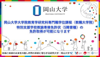 国立大学法人岡山大学(本部:岡山市北区、学長:那須保友)大学院教育学研究科専門職学位課程(教職大学院)では、岡山県内の特別支援教育の基柱となる教員を育てる中核大学として、その使命を果たすために、5障害種(視覚障害者、聴覚障害者、知的障害者、肢体不自由者、病弱者)の教育領域の専修免許状取得が可能になる教育課程を令和7年度から開始できるよう文部科学省に課程認定の申請中です(内容等については変更の可能性があります)。