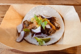 『そばティーヤ』とは、蕎麦打ちの生地をつくる要領で手でこねて、それからプレス機で1枚1枚丹念に円形に仕上げたもの。2024年9月8日 までに富山県南砺市利賀村で開催された演劇祭『SCOTサマーシーズン2024』の飲食ブースにBorrachoが出店し、富山県産ジビエ・イノシシ肉を使用した『シシニタスwithそばティーヤ』と豚肉を使用した『カルタニスwithそばティーヤ』を提供。そば粉欠品により一時売り切れとなるほど好評を博した。