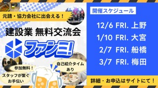 2024年12月6日 ㈮19時~建設業従事者を対象に、気軽に飲みながら一生モノの新規元請さんや新規協力会社さんと出会える建設業無料交流会「ファンミ!」を上野にて開催します!